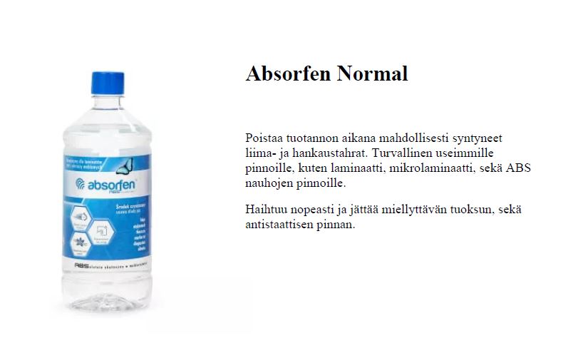 Puhdistusaine Absorfen 1 l Teollisuustuotteet » Reunanauhat » ABS-nauhat » Puhdistusaine Absorfen 1 l Koko Absorfen Normal Absorfen Strong Määrä Tuotekoodit 380900 Absorfen Normal380910 Absorfen Strong Saatavuus Varastossa